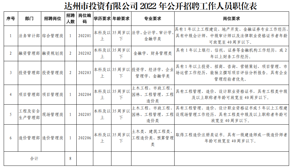 本次公開招聘設(shè)置崗位6個,擬招聘工作人員8人,其中:法務(wù)審計部1人、融資管理部2人、投資管理部2人、項(xiàng)目管理部1人、工程及安全生產(chǎn)管理部1人、造價管理部1人。