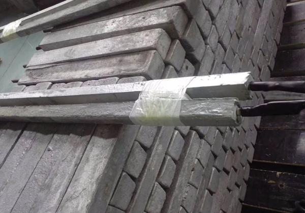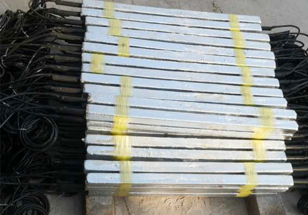 我公司生產(chǎn)的鋅接地電池由平行靠近的一對或四支鋅合金犧牲陽極棒組成,中間用絕緣墊塊隔開,然后一起裝在裝有填包料的棉布袋中,通過引出電纜焊接在絕緣裝置(絕緣接頭或法蘭)的兩側(cè),以防止強電沖擊引起的損壞,同時日常情況下接地電池也可對管道起保護作用。